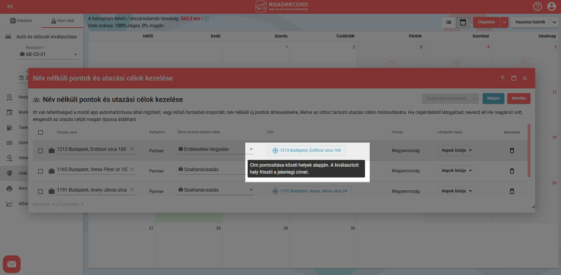 Ha a mobilalkalmazás olyan megállást rögzít, amelyhez nem talál a partnerlistában közel eső partnert, az utat anonim partnerlátogatásként, pusztán a címadatokkal menti el.