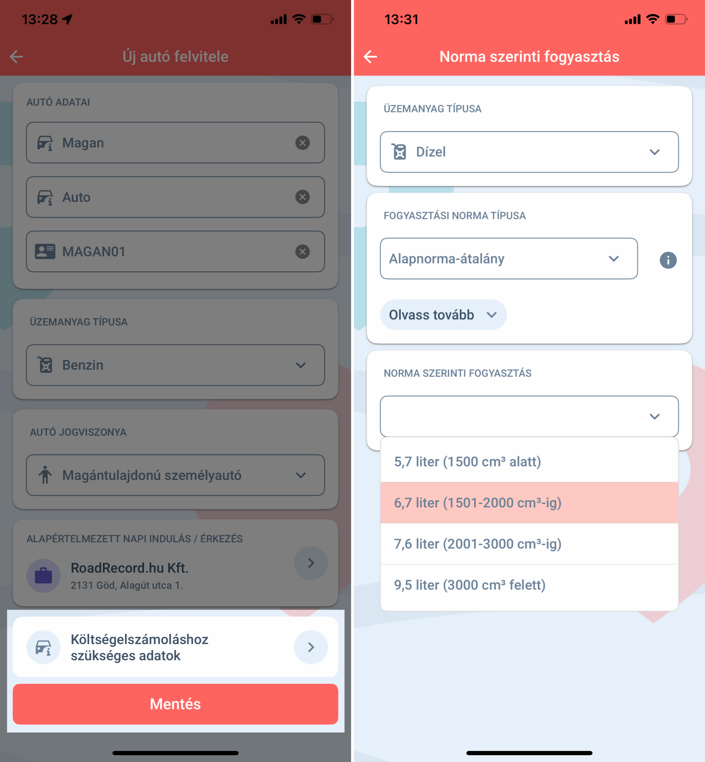A Költségelszámoláshoz szükséges adatok alatt add meg az adott üzemanyag-típushoz tartozó fogyasztási értéket, csak ezután mentsd el az autó adatlapját!