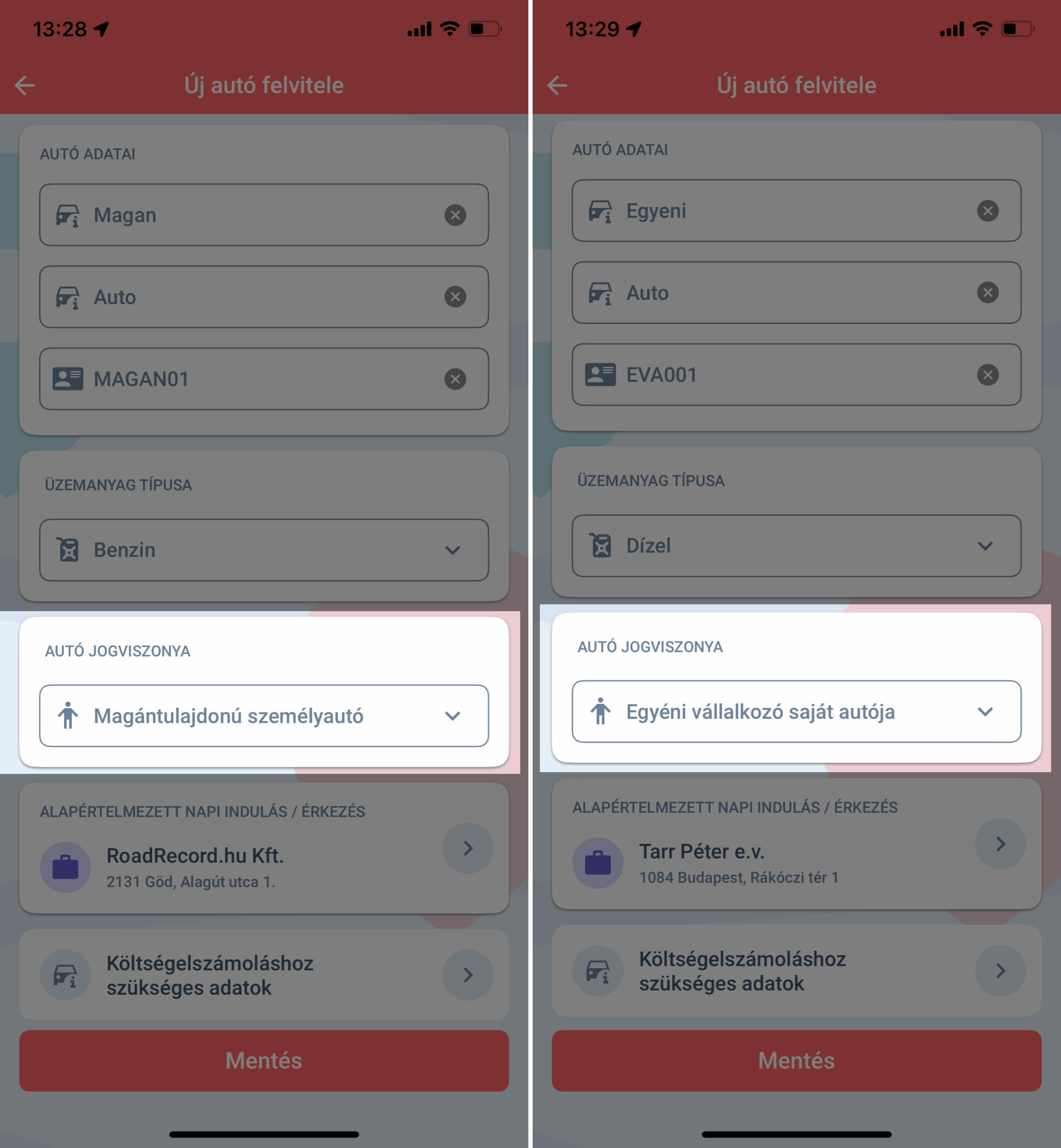 Céges autó esetében más adatokra nincs szükség,  koppints a Mentés gombra!